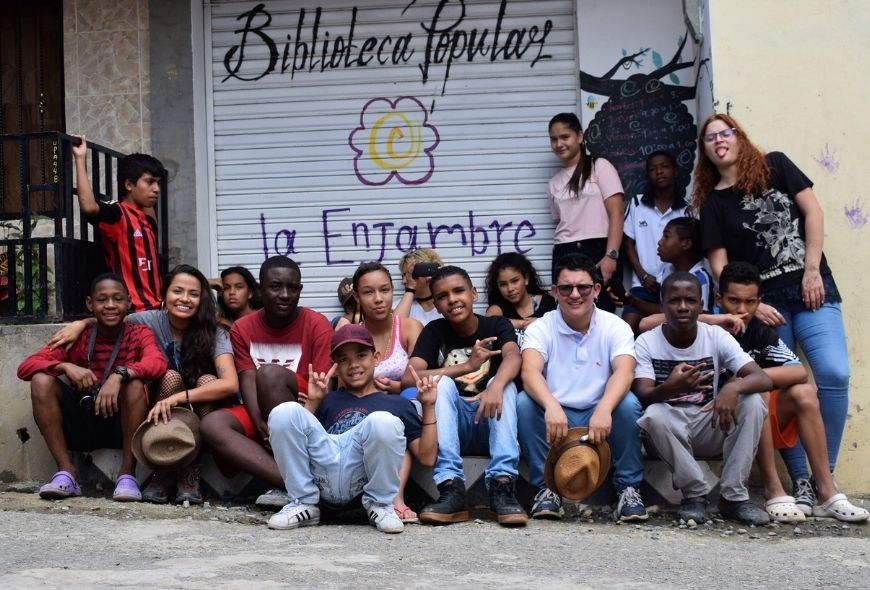 “La literatura ha sido un puente, una manera de fugarme, de reflexionar sobre la vida, sobre la muerte y sobre el mundo”. Desde que decidió seguir su pasión, ha compartido con otros ese amor por los libros y se sorprende de haber logrado lo que algún día vio como imposible: “Poder vivir de la fuga, vivir de eso que me hace feliz”. Luego de haber trabajado como promotora de lectura, escritura y oralidad con niños, niñas, adolescentes y jóvenes de distintos barrios en lugares no convencionales de la ciudad, como la calle, las canchas o los parques, estaba lista para crear. En 2016 nació Colectiva La Enjambre, una biblioteca popular ubicada en Altavista, en la sala de la casa de doña Olivia, lideresa de ese corregimiento en Medellín.