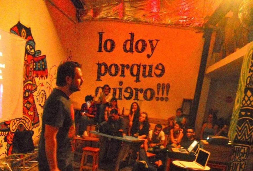A finales de 2007 tenía todo preparado para irme del país y se me ocurrió la idea de una empresa de desarrollo de tecnología con unos equipos que había inventado un conocido, lamentablemente después de 5 años de trabajo decidieron dejarme por fuera del negocio. Lo que hice a partir de ese momento, y durante los siguientes meses, fue escudarme leyendo todo lo que se me atravesaba sobre educación, un tema que me apasionaba. Un día me fui a conocer el bar que estaba por abrir un amigo que tenía un salón atrás para fiestas. Cuando entré a ese espacio mi cabeza enloqueció, mientras más lo detallaba más se iba creando la idea en mi mente, le dije que me diera unos días para presentarle una propuesta para ese espacio y el 3 de agosto de 2011 se realizó la primera sesión de Lo doy porque quiero.