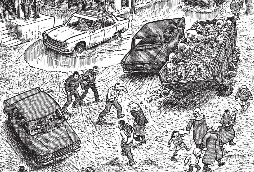 En la inmersión Sacco nos muestra, entre tanto, cómo era vivir hace treinta años en el campamento de refugiados de Yabalia, las condiciones de los asentamientos y las dificultades materiales en las que sobreviven los palestinos en medio de las carencias, las lluvias y el invierno. Esta inmersión se prolonga por varios capítulos en los cuales no solo seguimos al dibujante buscando testimonios, sino peregrinando por las calles inundadas y llenas de barro, reconstruyendo el origen de la Primera Intifada, reflejando el estado de las cosas en Yabalia: un campo de miseria y basura que fue borrado en los bombardeos de los últimos meses. Viendo lo dibujado por Sacco, de su trabajo de hace treinta años, me preguntaba ¿Qué podría ser peor en Yabalia? La respuesta está en cómo ha quedado Yabalia en las últimas semanas.