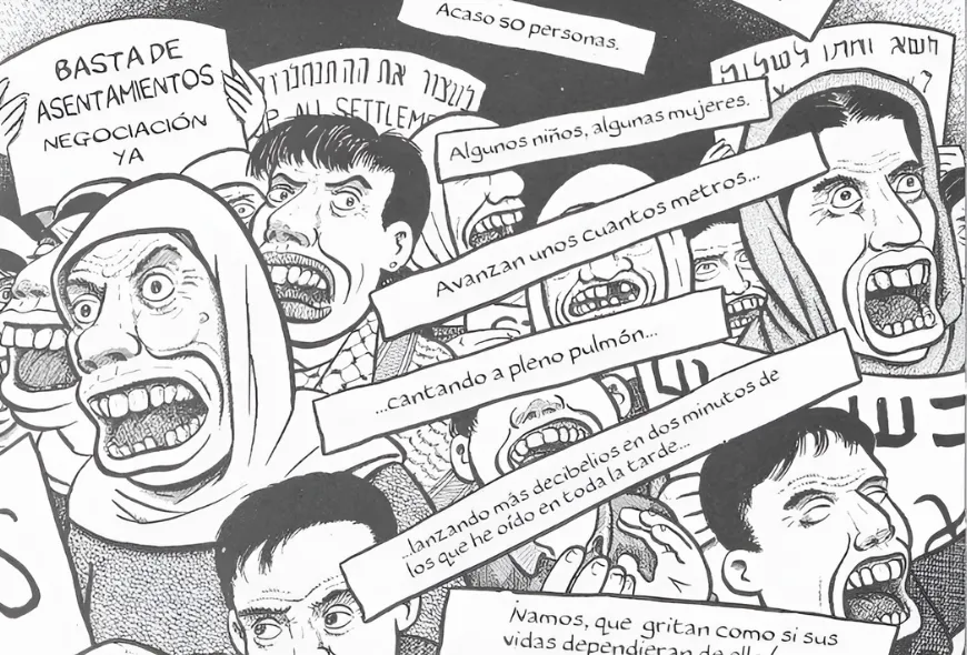 Sacco se sale entonces del manual, no se muestra imparcial porque su investigación de dos meses y medio por Israel y los Territorios Ocupados fue un modo de tener una versión distinta a la versión oficial que circulaba hasta entonces y sigue circulando en los Estados Unidos, sus colonias, y el norte global del mundo occidental. El dibujante no sólo informa, toma posición, se pone del lado de las víctimas. De modo que fuera del juego de la libertad de expresión y las estructuras del buen periodismo, aséptico y equilibrado, de la narrativa publicitaria que sirve para contar historias positivas, el dibujante crea un espacio de representación lo más cercano posible al lugar dónde está contando, de ahí su esfuerzo por crear espacios detallados y realistas, en los que no se pasa de largo, sino que se habita con los palestinos, en los que el lector ve de cerca aquello que le puede resultar ajeno.