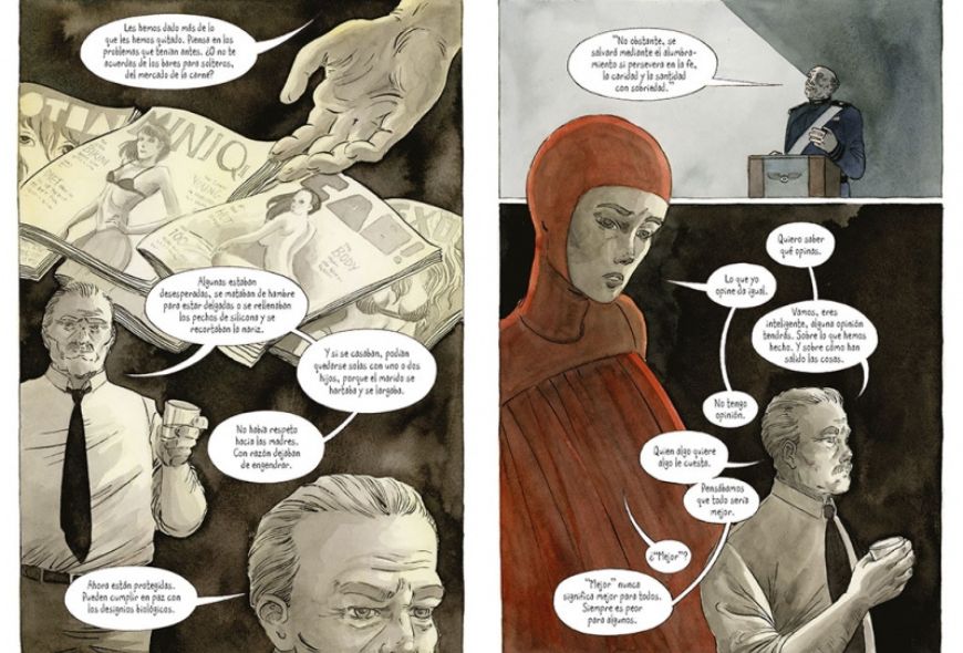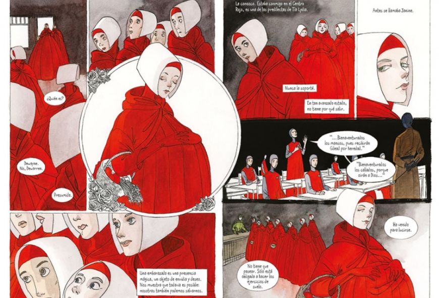 Cuando hablamos de una versión nueva de una narración que ha tenido gran impacto en la literatura, como la novela de Margaret Atwood El cuento de la criada o la serie de televisión del mismo nombre protagonizada por Elisabeth Moss, es difícil encontrar algún atractivo alterno en términos narrativos que pueda señalarse en el nuevo espacio contado. Lo que se cuenta, en el nuevo lenguaje puede verse atrapado por la repetición argumental o simplemente no decir algo más allá de lo que se ha leído y visto en imágenes. Pero si hablamos de que la versión es dibujada, tal vez, se pueda encontrar algo más allá del relato escrito y actuado. No solo por el hecho del dibujo en sí, sino por lo que se puede lograr con el dibujo y el uso de otros elementos como la composición, la inserción de colores o el modo en el que se estructura el relato dibujado en las páginas.