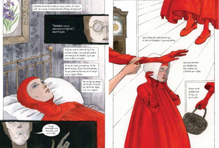 Por otro lado, Nault usa los aspectos antes subrayados para crear un estado visual que está intervenido por los silencios y un tono exótico y lúgubre, creando así superposiciones de tiempo y espacio en las páginas para mostrar a la vez el tiempo presente de la narración y los recuerdos de lo que era el mundo de la República de Gilead antes de la perversión. De este modo, en el cruce de los eventos, entre pasado y presente, hay una constante tensión entre los rojos y los grises, y la paleta de colores más amplia que se usa para situar el pasado que es abiertamente devorado por los rojos, sus manchas y los tonos intensos que arropan los cuerpos de las mujeres subyugadas; un rojo que se mueve con suficiencia, rompiendo el diseño de página, los silencios, las paredes y los fondos; se convierte en una gran mancha que en su movimiento simboliza el estado distópico y totalitario de la narración original.