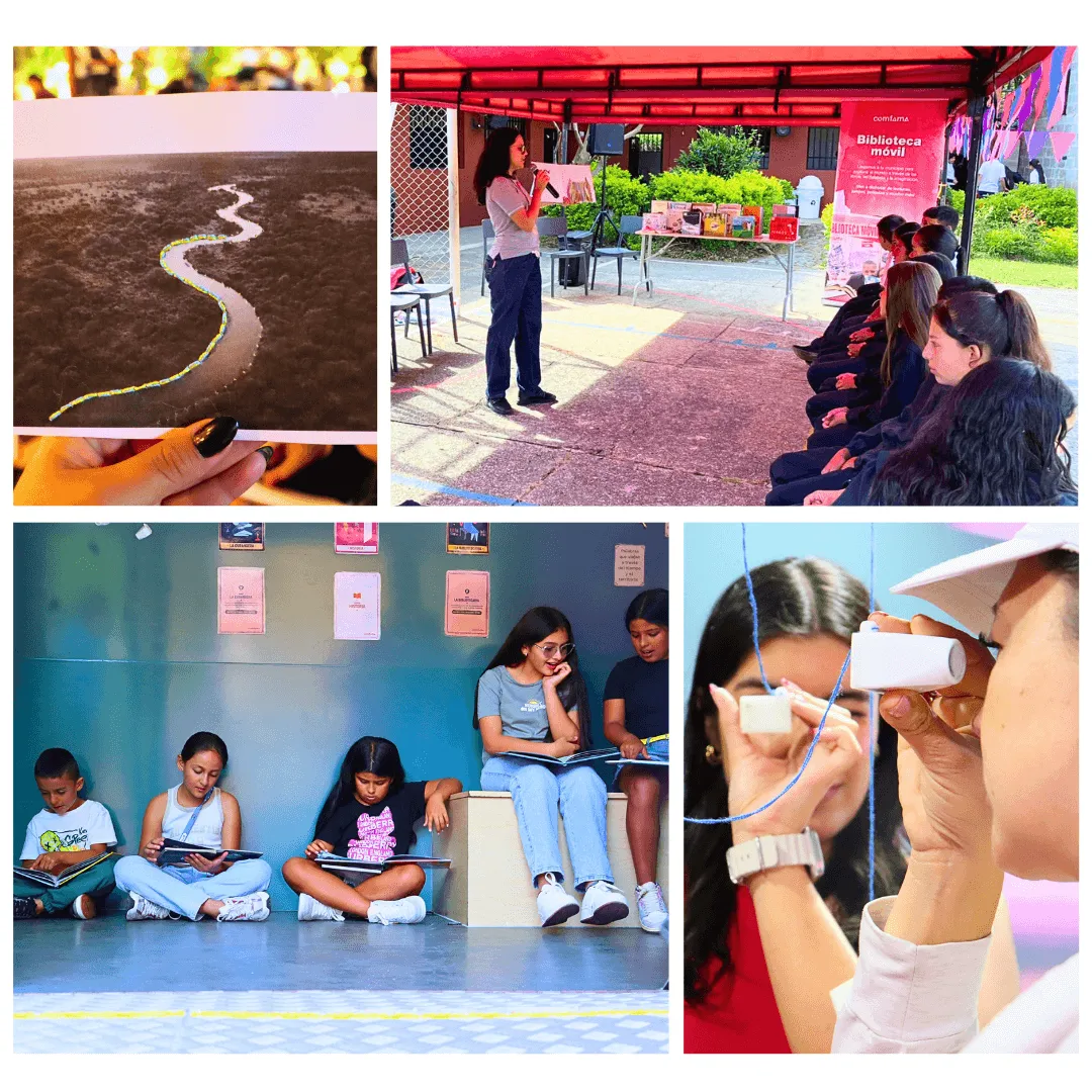 La Biblioteca Móvil de Comfama desplegó su caravana de palabras. En Estrella Nueva y Palocabildo, dos veredas de Jericó, la escritura tomó forma entre manos que bordaron la memoria del río, entre niños que crearon paisajes de papel. En el Parque principal del municipio, además de que también se bordó la memoria, se habló del río y de los libros que se lanzaron en el Hay, la Móvil dispuso de manera permanente historias para lectores sin afán, y en los rincones del pueblo, las voces de los mediadores buscaron oídos atentos: un regalo de lectura en voz alta bajo el sol de la tarde.