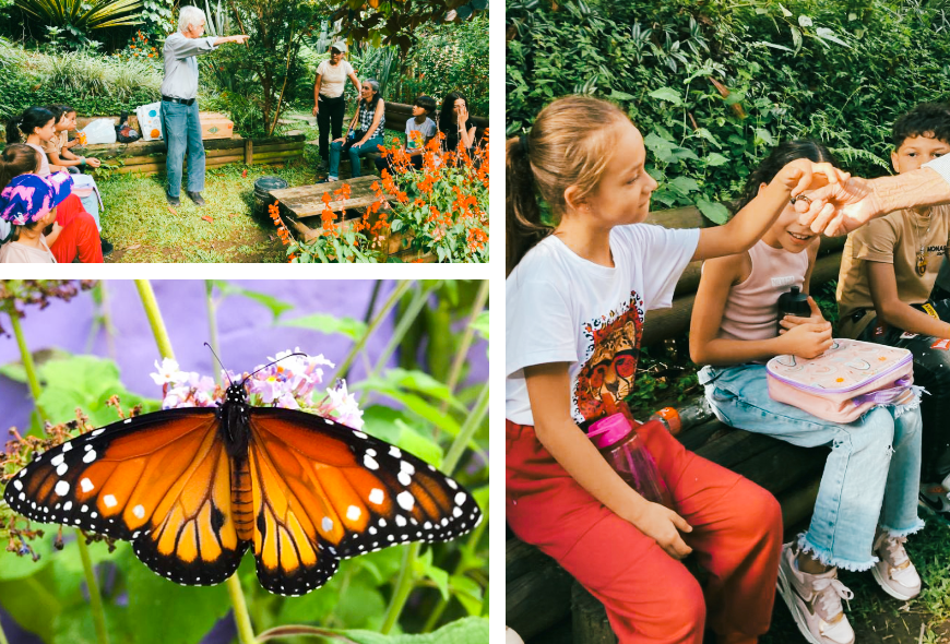 Una de las actividades más hermosas que vivimos en el Parque Las Mariposas, fue el apadrinamiento de una oruga. Estos pequeños cazadores de historias acompañaron ese proceso de transformación, se convirtieron en amigos y confidentes, pero también tenían una misión: limpiar sus casitas, ofrecerles alimento y, quizás, contarle a su oruga alguna historia. Cuando las mariposas salieron de sus crisálidas, volaron hacia las flores que encontraron cerca para alimentarse de su color, para tomar un poco de esa flor y llevar un pedacito de ella a otros lugares.