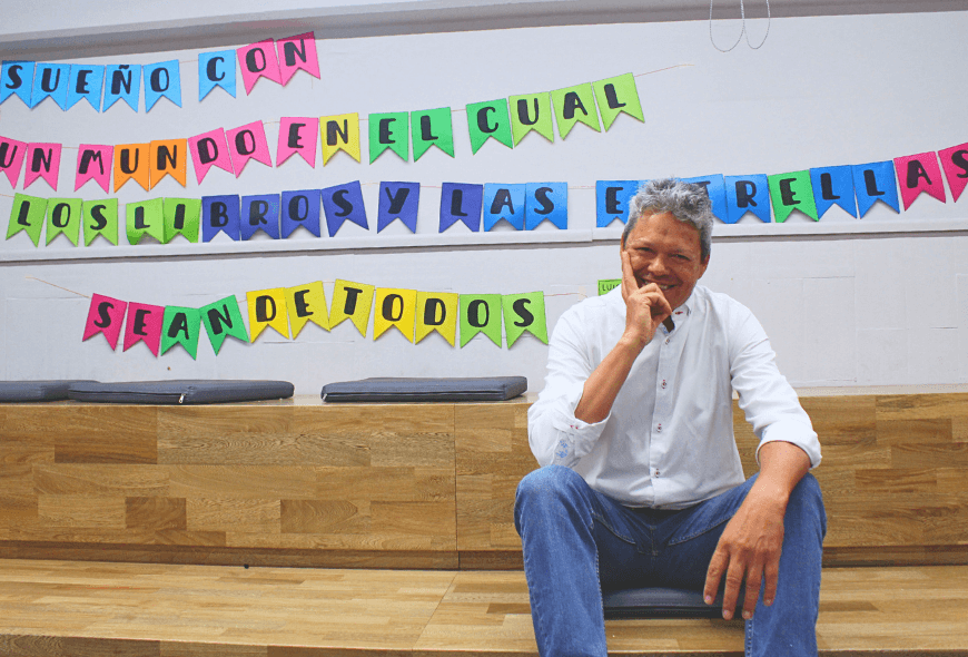 En la pared donde estaban recostadas las gradas, con vanidad vi, cuando los niños se retiraron, una frase que aparece en uno de mis cuentos: “Sueño con un mundo en el cual los libros y las estrellas sean de todos”. Seguí inspeccionado el espacio, miré las colecciones, los usuarios, un tablero mágico con la programación de ese día escrita con marcadores rojos, azules y verdes y otra con mi fotografía impresa en una hoja de blog puesta casi a la entrada de la biblioteca.