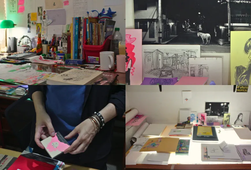 En el centro de una mesa, la fotografía de Susan Sontag aparece como un satélite que rodea cuadernos de bocetos que se mezclan con las portadas de uno de los últimos proyectos editoriales: .q.b. + BB3 que comparte con Juliana Devis donde se ha permitido ediciones antológicas de su trabajo y, la proyección de una colección (Zinema cómics) de dibujantes latinoamericanos que caminan por los bordes, y les importa poco tener fantasías con el canon o las excluyentes celebraciones del año.