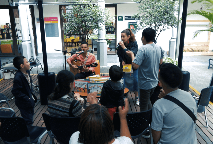 Las canciones y las historias recorrieron los corredores antiguos del Claustro Comfama. La música manchó las paredes y las voces de los niños pintaron el ambiente. El silencio tuvo que esconderse por un momento y cederle el escenario a María del Sol Peralta, escritora, cantante y promotora de lectura quien es reconocida por iniciar la algarabía cuando llega a las bibliotecas. Durante su experiencia como bibliotecaria: recomendó libros, conversó con los usuarios y dio una hora del cuento musical para los niños y las niñas.