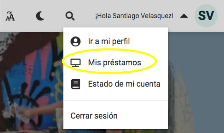 3. Una vez inicies sesión, tu nombre debe aparecer en el mismo lugar donde antes estaba “Iniciar sesión”. Da clic en el triángulo que se encuentra al lado de tu nombre para que se despliegue el menú de opciones. A continuación selecciona “Mis préstamos”.