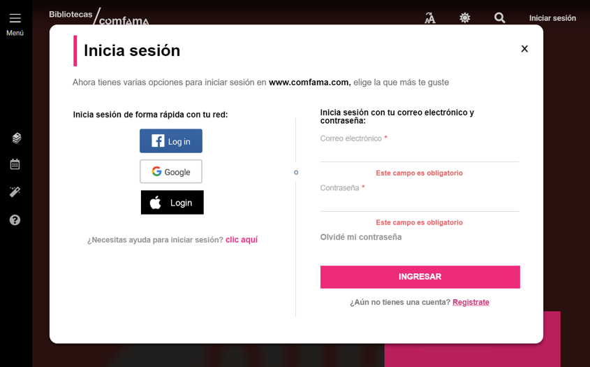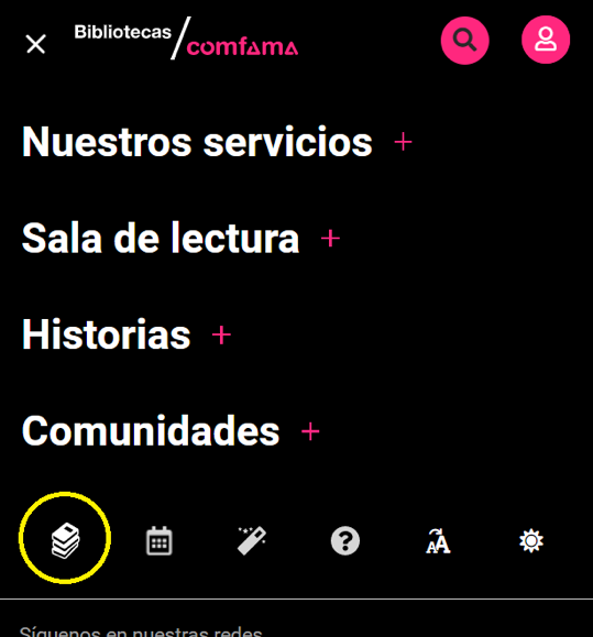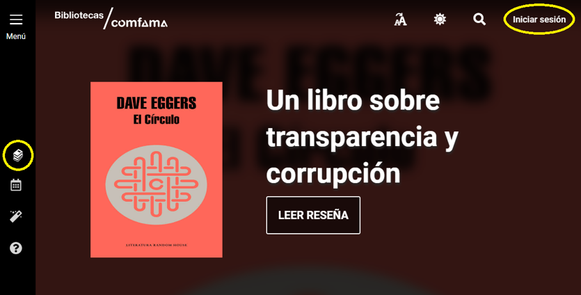 1. Ingresa a www.comfama.com/bibliotecas. En la parte superior, haz clic en “Iniciar sesión” o utiliza el acceso rápido “Mis préstamos” de la barra lateral.