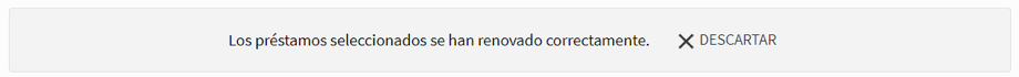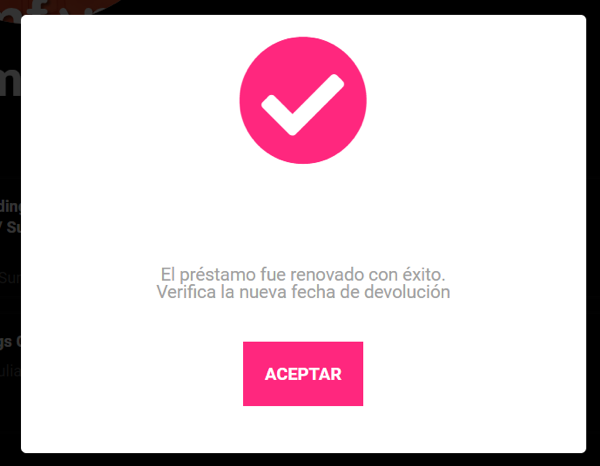 5. En ambos casos, una vez hayas presionado el botón “Renovar”, obtendrás un mensaje que te indicará si la renovación resulta exitosa. Pulsa el botón “Aceptar” y verifica que la fecha de vencimiento haya cambiado para los préstamos físicos. En el caso de los libros y audiolibros digitales, verifica que hayan sido puestos en la lista de espera.