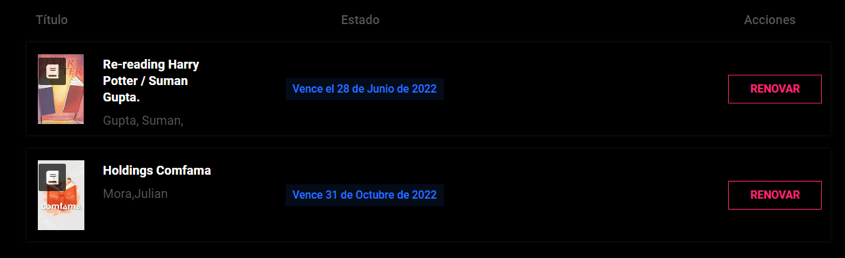 Para los préstamos de libros físicos, tendrás la posibilidad de renovarlos presionando el botón “Renovar”, siempre que no te hayas pasado de la fecha de vencimiento ni hayas renovado tres (3) veces el mismo material.