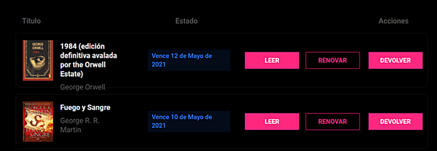 4. Desde allí podrás conocer los títulos físicos y digitales que tienes en préstamo y sus fechas de vencimiento. Si el estado de tu préstamo lo permite, verás el botón “Renovar” con el que podrás extender el tiempo.