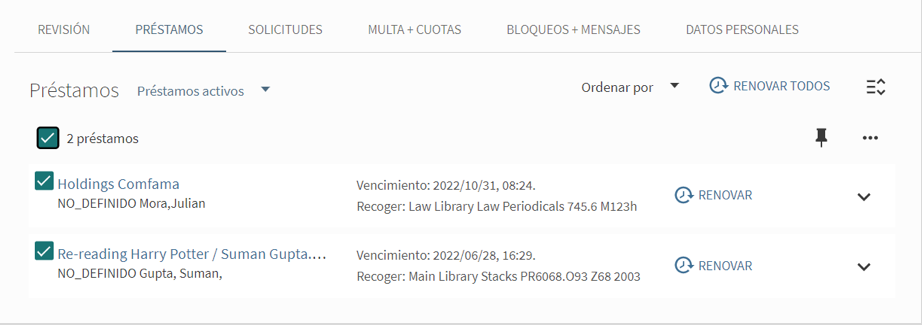 Sabemos que en ocasiones tienes una gran cantidad de préstamos de libros físicos para renovar el mismo día. Cuando lo requieras, en lugar de ingresar en el menú a la opción “Mis préstamos”, utiliza la opción “Estado de cuenta” ya que ésta te llevará a nuestro descubridor y buscador avanzado. Allí haz clic en la pestaña “Préstamos” y selecciona uno, varios o todos los préstamos que deseas renovar simultáneamente. El botón “Renovar todos” cambiará a “Renovar seleccionados” dependiendo de la cantidad de préstamos que selecciones.