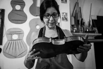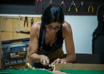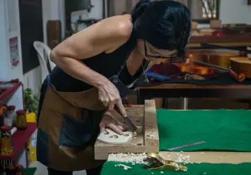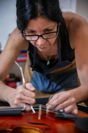 El primer día que llego al taller, me entrevisto con el maestro Giorgio y él llama a su hermano y coordinador de taller y le dice: "Cristina va a trabajar con nosotros durante tres meses, por favor darle el material para que fabrique dos violines, comienza a trabajar desde hoy". Al escuchar esas palabras, fue demasiado atemorizante, un reto enorme, en vista de que, en ese momento, me demoraba hasta 8 meses para construir un violín. Comienzan las inseguridades a rondar mi cabeza: ¿A dónde me metí?, ¿sí seré capaz de cumplir? No sabía que nuevas técnicas de trabajo y herramientas podrían posibilitarlo; sería parte fundamental del aprendizaje.