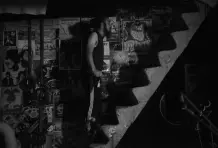 El siguiente encuentro fue cuando visité su estudio/casa, un lugar cálido, artístico, con una hermosa esposa que tiene una energía que wow, y unas mascotas que me robaron el corazón. En este lugar compartimos historias, conversamos de gustos en común, un poco de todo, pude sacar como 3 fotos aquel día, porque realmente sentía que debía compartir con él y verlo en diferentes situaciones, en su vida real, como ser humano como artista. Nuestro siguiente encuentro fue en una entrevista que tenía con una de sus bandas ¨Los Malkavian¨ y pude verlos en acción, compartir con todos y hacer otras cuantas fotos que aún no me hacían sentir con un proyecto culminado. Sobre este día vi cómo era El Pela con sus amigos, con otras personas y realmente es una persona muy cálida con la que se puede hablar muy fácil. Compartimos una cerveza, los escuché y me despedí feliz de poder vivir esa experiencia con ellos aquel día.