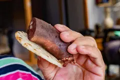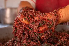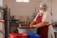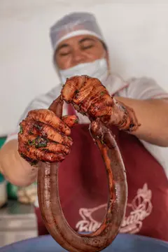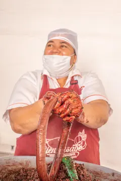 Las morcillas las hace muy temprano en la mañana: monta el arroz, que es lo más demorado, y pica muy fino cebolla de rama y cilantro. También saca comino y trozos de tocino previamente cocinados. Todo eso lo mezcla en un recipiente al que le agrega sangre de cerdo licuada con ajos, y un poco de sal. De ahí en adelante sus manos son las protagonistas; son grandes y fuertes, porque en su juventud practicó lanzamiento de bala y atletismo, época de la que quedaron trofeos y medallas que exhibe orgullosa en la sala de su casa.