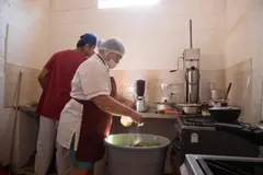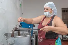 Con esas mismas manos desmenuza el arroz con destreza, le revuelve los aliños y agrega un poco de sangre. Lo importante es que no queden grumos. El relleno es un proceso que también hace manual y más o menos hacia el medio día queda listo. Entonces pone la morcilla a cocinar y con un tenedor va chuzando.