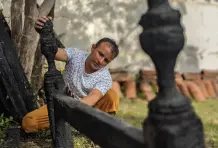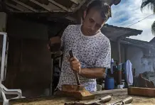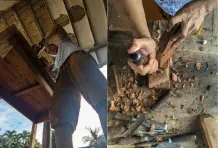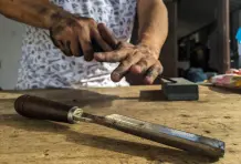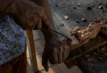 Al calor de Santa Fe de Antioquia en una tarde de verano, dentro de un solar ubicado en la parte de atrás de una antigua casa de esquina donde funciona una tienda familiar, el artista Fredy Puerta, busca extraer figuras amorfas de los restos calcinados de varios trozos de madera que encontró en el incendio que ocurrió en la Quinta de la Amargura el 6 de agosto del 2019, famosa porque allí se grabó en los años 90 la telenovela ‘La casa de las dos palmas’, basada en la novela homónima del escritor antioqueño Manuel Mejía Vallejo. Con un trabajo paciente hecho con equipo apropiado para la madera, Fredy talla el leño siguiendo un mapa de texturas que está impreso en la parte de los largueros donde el fuego se detuvo por cansancio de arder poco antes de extinguirse. Así, siguiendo las fisuras que deja el carbón, realiza una propuesta artística empujada por las gubias y el formón que se acerca a la genética de lo que fue el árbol.