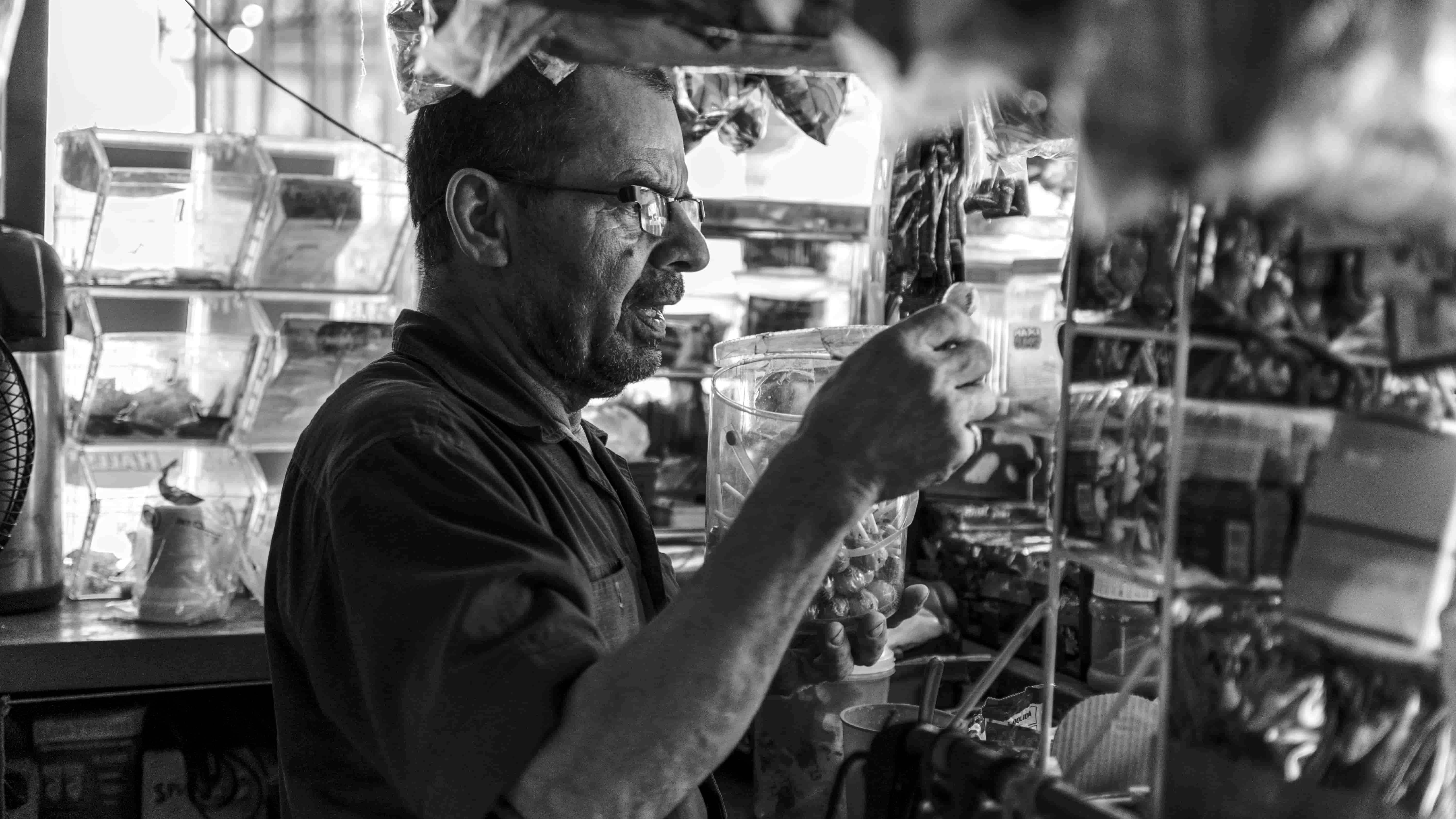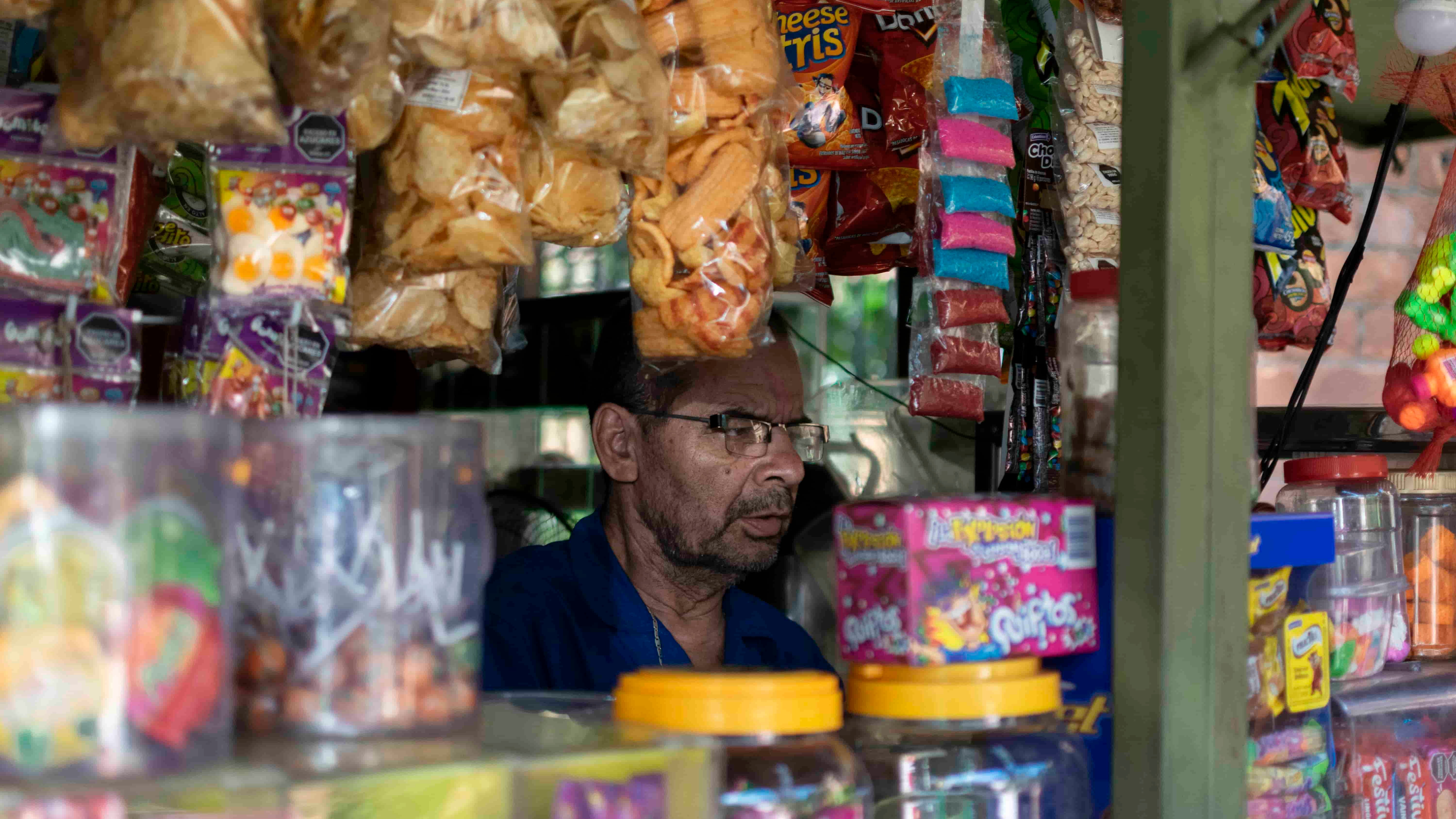 Es corto de vista, pero en su chaza es capaz de encontrar hasta el mecato más pequeño. Como si los dulces que vende fueran una extensión de su propio cuerpo, puede alcanzarlos aún en la oscuridad que le genera la ausencia de visión. Y aunque dice no ser estudiado, sabe que en el campo cogió cierto sentido. Pícaro, memorioso y avezado para las ventas.