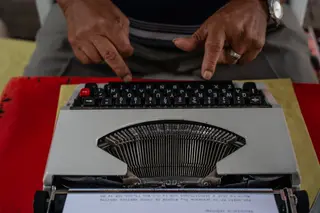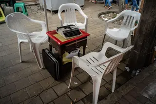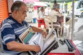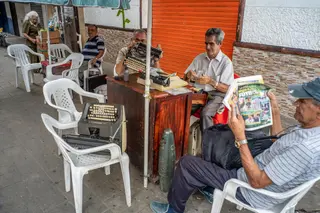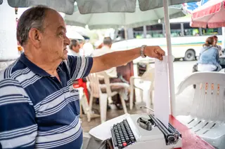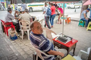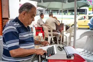 Cada mañana, Jorge camina hasta allí con su máquina en la mano como si fuera un pequeño maletín ejecutivo. Desempaca su Olivetti vieja, rebobina la cinta, alista una hoja de papel bond tamaño carta y se sienta en su Rimax blanca a esperar a que llegue algún cliente. Cada día menos personas solicitan sus servicios. Y cada día se extingue un poco más el oficio con el que levantó a su familia.