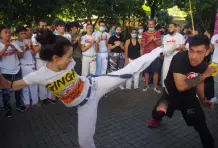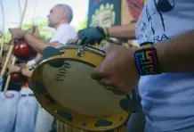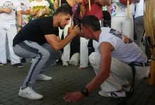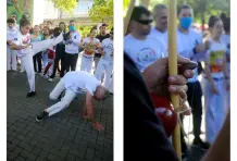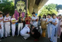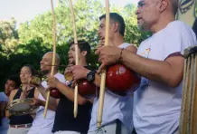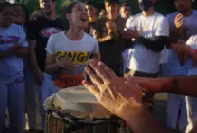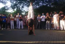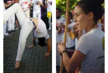 Son las tres de la tarde del domingo. Debajo del viaducto del metro frente al Jardín Botánico se escucha una música que no es habitual en Medellín, hecha con tambores, panderetas y berimbáu, un instrumento de cuerda que consiste en un arco de madera del que está pegado una calabaza. Dos contrincantes entran a la roda, se ponen en cuclillas frente a los músicos y piden permiso para empezar su jogo. Alrededor todos los asistentes bailan, cantan y aplauden mientras comienza una danza de ataques y defensas con movimientos fluidos, saltos mortales, paradas de manos, patadas y bloqueos acompañados de música y cantos. Los instrumentos marcan el ritmo del combate, y algunas veces el cantador improvisa y narra lo que está pasando en la rueda. En cualquier momento un tercero puede pedir permiso a los músicos para reemplazar a uno de los jugadores y cambiar los protagonistas. Al final nadie gana, aunque salir con el uniforme sucio es una deshonra.
