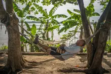 Se sienta en la mesa de la cafetería a la orilla del Río Magdalena y lo atienden como una madre al hijo que regresa a casa después de muchos días de camino. Le sirven un plato repleto de barbudos fritos, otro plato aparte con una montaña de patacones y un pocillo plástico de tinto para ir enjuagando el buche. A un lado la mochila en la que carga sus cosas, incluida su cámara y uno a uno, engulle los bocadillos fritos dejando intactos los espinazos que se iban acumulando en una montaña como prueba del manjar.