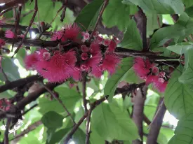 La pomarrosa atrae con su aroma a las polinizadoras del jardín. Desde lo alto su universo es otro, violetas, flores, frutos, todo un festín para sí mismas..