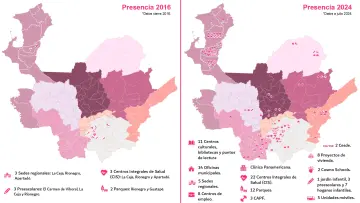 En cuanto a la cobertura en salud que ha ido creciendo sustancialmente durante los últimos años y gracias a aliados como Sura EPS, Comfama pasó de tener, en 2016, 3 centros de salud por fuera del Valle de Aburrá a ofrecer 22 de estos para el cuidado y el disfrute de la vida de los antioqueños. Lo anterior complementado con la Clínica Panamericana, que ofrece atención de alta complejidad para todo el Urabá (tan solo en 2024 ha hecho más de 341 mil atenciones) y 3 centros de acondicionamiento físico que buscan aportar a las soluciones de prevención en salud.