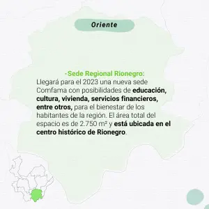 Sede Municipal Rionegro: ya iniciaron las obras para la construcción de la sede regional de Oriente, que estará ubicada en el Centro histórico de Rionegro (Calle 48 # 50 – 74). Esta nueva sede regional de Comfama en el Oriente continuará acompañando a los afiliados con posibilidades de educación, cultura, vivienda, servicios financieros, viajes y recreación. El área total del espacio es de 964 metros cuadrados, que se distribuirán en tres nivales, lo que suma un total de 2.750 m².