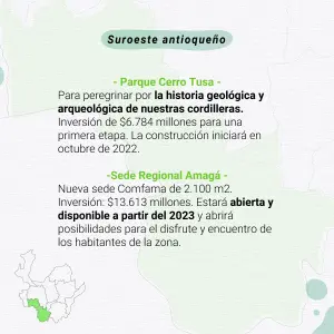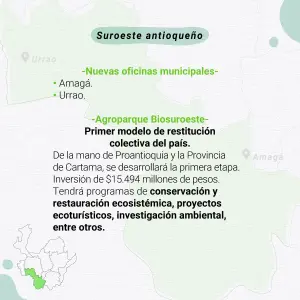 Agroparque Biosuroeste: es el primer modelo de Restitución Social Colectiva del país, que de la mano de Proantioquia y la Provincia de Cartama, en un área de 600 hectáreas, distribuidas entre los municipios de Valparaíso y Támesis, acelerará un proyecto que contará con programas de conservación y restauración ecosistémica, proyectos ecoturísticos, actividades de investigación ambiental e iniciativas de incubación, emprendimiento y desarrollo empresarial en el Suroeste antioqueño. Para la primera etapa del proyecto, la inversión es de $15.494 millones y, poniendo en marcha un portafolio de contenidos, servicios y atracciones, se espera movilizar cerca de 327 mil visitantes en 2024.