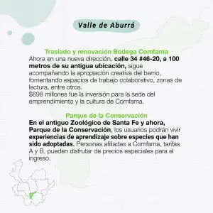 Traslado y renovación Bodega/Comfama: desde el mes de agosto, la Bodega cruzó la calle y se ubica ahora en la Calle 34 # 46-20, a tan solo algunos pasos de distancia. En su nueva ubicación continúa siendo parte de la apropiación creativa y cultural del barrio, a través de espacios como zona de lectura, de trabajo colaborativo y la nave central que da lugar al desarrollo de una amplia agenda asociada al universo creativo y del emprendimiento. Este nuevo espacio requirió una inversión de $ 698 millones para adecuar alrededor de 1200 m², dónde participó un equipo de alrededor de 30 personas.