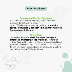 Renovación del Claustro Comfama: este será uno de los centros culturales y educativos más importantes de Comfama en Antioquia. Tendrá espacios como patio-teatro, café, biblioteca, centro de servicios, galería, museo, sala de cine, estudio audiovisual, mediateca, instrumentoteca y salones para las respectivas clases de todos los contenidos ofrecidos. Cuando el espacio esté terminado, en el centro cultural y educativo trabajaran aproximadamente 187 personas. En esta primera etapa, la obra se encuentra en un 26 % de avance. En total se estima realizar una inversión es de $ 54.000 millones.
