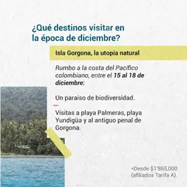 En medio de la naturaleza, en la costa del Pacífico colombiano, quienes decidan hacer este viaje podrán disfrutar de un paraíso de biodiversidad con una experiencia de 4 días y 3 noches de descanso y tranquilidad. Entre otras actividades, incluye visitas a playa Palmeras, playa Yundigüa y al antiguo penal de Gorgona. Los costos (todo incluido) van desde $1'865,000 (afiliados tarifa A) y será entre el 15 al 18 de diciembre.