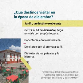 Uno de los pueblos más lindos de Antioquia, con sus caminos de piedra, aroma a café y un deleite de paisajes, árboles y flores que adornan los senderos urbanos y las praderas rurales del municipio. Este viaje va del 17 al 18 de diciembre. Cualquier persona puede acceder a este viaje, sea o no afiliado a la Caja de compensación, sin embargo, para afiliados categoría de afiliación A (devengan entre uno y dos SMMLV, es decir, hasta $2.000.000) el valor va desde $324,000.