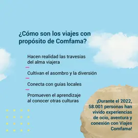 Comfama promueve los viajes con propósito como una posibilidad de hacer realidad las travesías del alma viajera, con actividades que cultiven el asombro, la diversión y, también, permitan ampliar la visión del mundo.