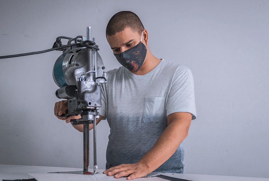 Desde aquella conversación interior, ‘Taborda’ pasa las mañanas haciendo moldes, cortando tela, y coordinando el proceso de producción de las camisas, que confeccionan mujeres cabeza de familia, y que sublima en un taller local.