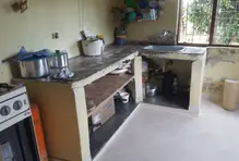 Teniendo en cuenta que Clara tiene una fábrica de arepas, se decidió instalar un mesón en acero inoxidable para acondicionar mejor la cocina, pensando en su emprendimiento y en los ingresos extra que esto representa. Además, gracias al aporte del municipio, se realizó el revoque general de la vivienda y la pintura en muros internos.